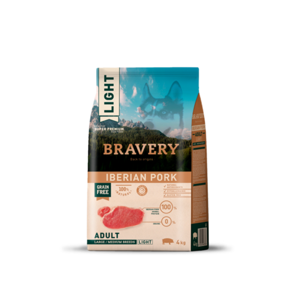 Bravery Pet Food nació a partir de una consulta generalizada, a distribuidores y consumidores finales, en la que se preguntaba cuál sería su propuesta para el mejor alimento para su perro que existiese. Aunando todas las respuestas nace Bravery, un producto referente a nivel de calidad en el segmento de los super premium.BRAVERY IBERIAN PORK LIGHT ADULTO RAZAS MEDIANAS Y GRANDES 4 kg