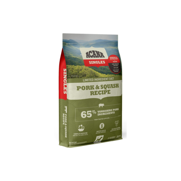 Con un 60% de cerdo Yorkshire para nutrir a tu perro de acuerdo a sus necesidades evolutivas, ACANA Pork & Squash contiene una sola proteína animal de fácil digestión.