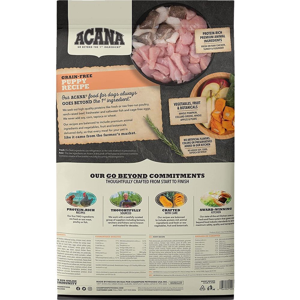 En comparación con algunos alimentos para cachorros, ACANA ofrece más calorías de proteínas y grasas y menos calorías de carbohidratos, promoviendo la salud máxima de su cachorro. La energía metabolizable es de 3575 kcal / kg (408 kcal por taza de 8 onzas), con 30% de proteínas, 25% de carbohidratos y 45% de grasas.