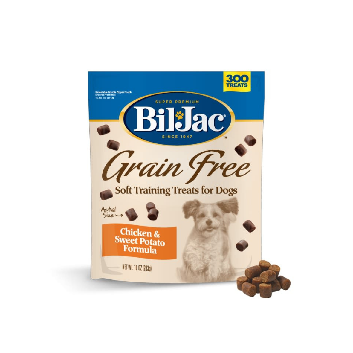 Bil-Jac® Grain Free Soft Training Treats for Dogs, es un delicioso snack para perros adultos libre de granos, hecho con pollo de verdad y camote, un sabor que a los perros les encanta. El tamaño pequeño de la croqueta es ideal para entrenar con recompensas, también para perros de razas pequeñas. Una alternativa libre de granos que permite que tu perro se destaque, no solo no tiene granos sino que tampoco está hecho con harina de gluten o grasa pulverizada.