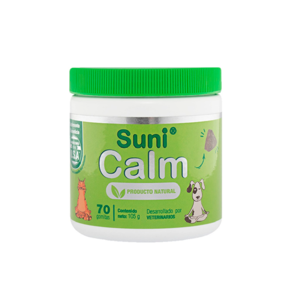 SUNICALM CALMANTE NATURAL 70 und Tranquilizante Natural SuniCalm es un suplemento alimenticio 100% natural, desarrollado por veterinarios en Estados Unidos, que ayuda a aliviar el estrés y problemas de comportamiento. Puede ser usada una vez al día o en caso de emergencia. Viene en forma de gomita, para que sea fácil de administrar. 105 gr