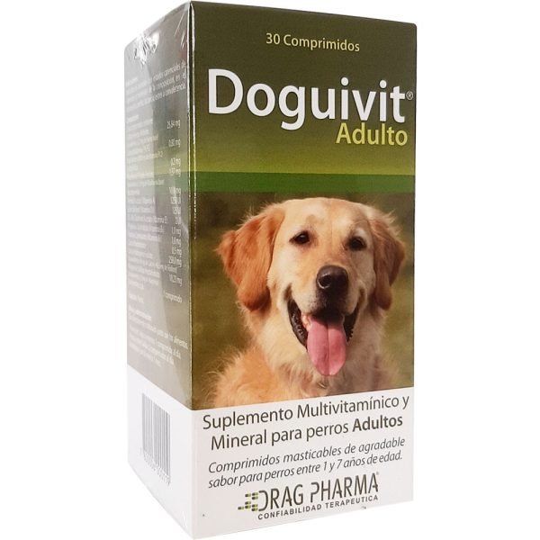 DOGUIVIT ADULTO 30 und MASTICABLES Multivitaminico para perros adultos. Comprimidos masticables de agradable sabor para perros entre 1 y 7 años. 30 comprimidos (DRAG PHARMA). Indicado en animales con estados carenciales de vitaminas y minerales de la composición, en el crecimiento, preñez, lactancia, estrés o convalecencia.
