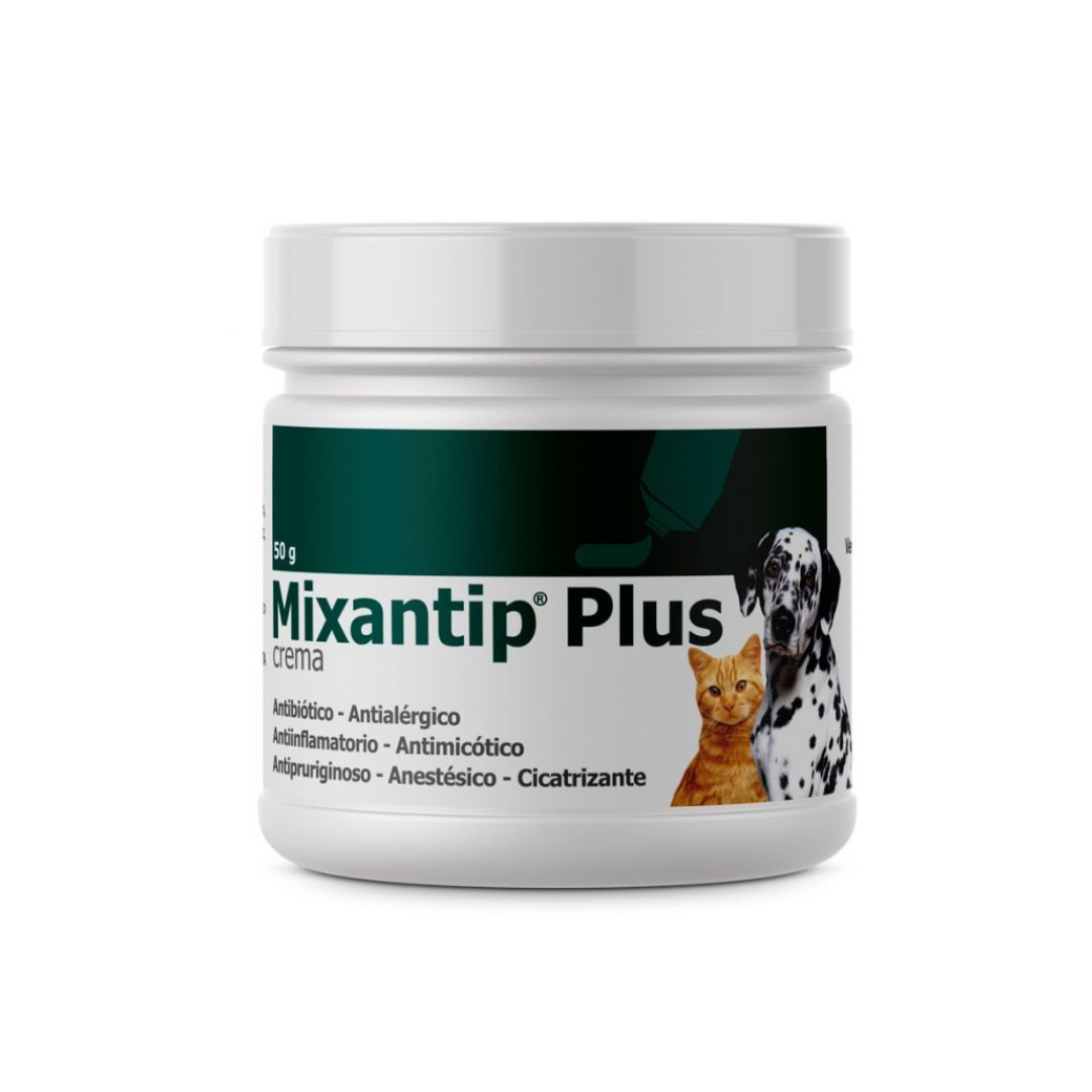 DragPharma Mixantip Plus 50 gramos es una crema para la piel de gatos y perros con propiedades antibióticas, antialérgicas, antinflamatorias, antimicóticas, antipruriginoso, anestésico y cicatrizante que ayuda en el tratamiento de infecciones bacterianas y micóticas, inflamaciones dolorosas y difusas de la piel y prurito en animales de compañía, dermatitis, eczemas, piodermas y excoriaciones.