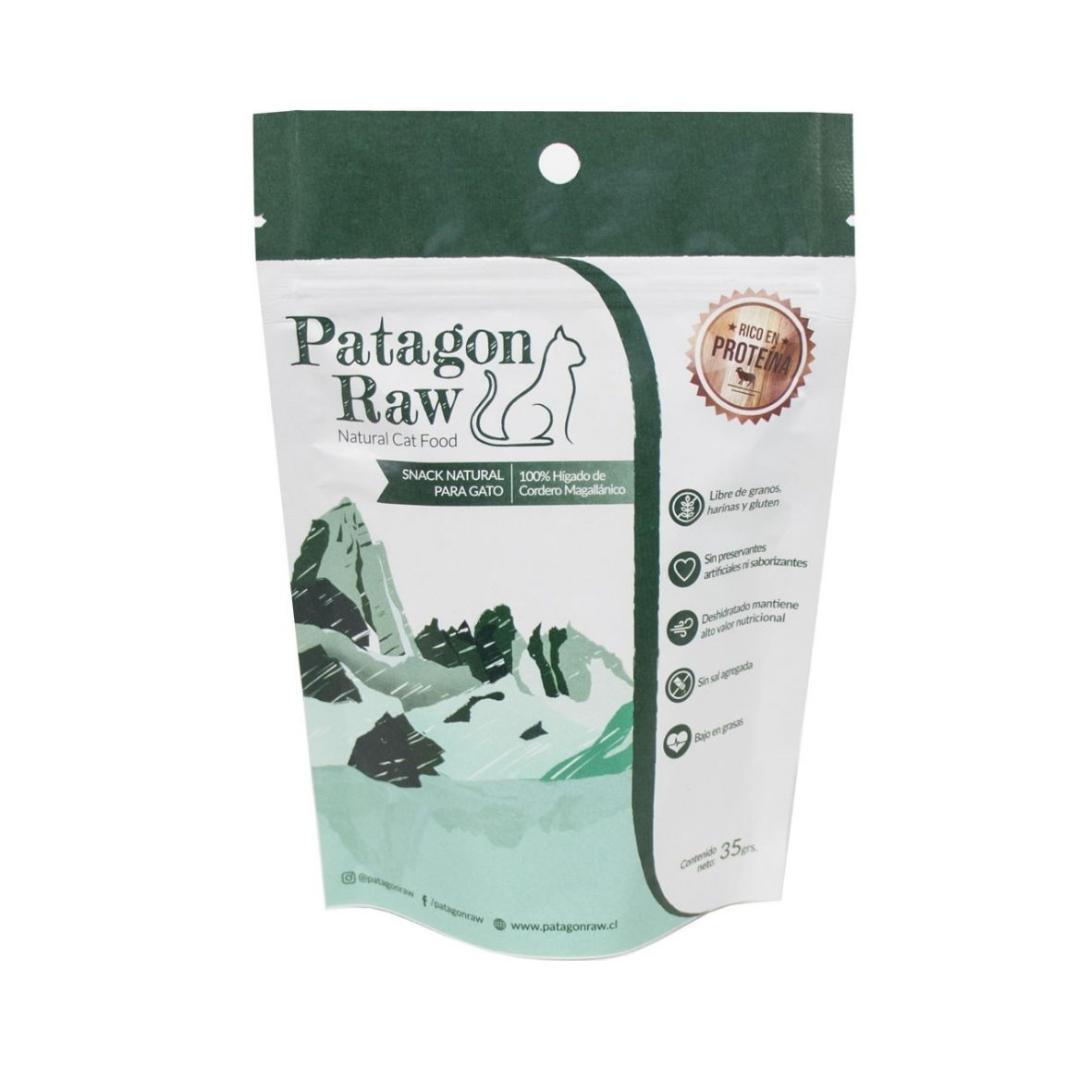 Patagon Raw Snack Hígado de Cordero es un premio para perros 100% natural, formulado con cordero magallánico de libre pastoreo traídos desde Punta Arenas. Es un snack naturalmente alto en vitamina A, complejo de vitamina B, Hierro y Zinc, entre otros. Libre de granos, harinas y gluten: los únicos carbohidratos que contiene el snack de hígado es el que se presenta naturalmente en éste (por la función biológica que cumple el hígado). Sin preservantes artificiales, colorantes o saborizantes. Sin sal agregada. Elaborado con carnes certificadas de grado de consumo humano. Ideal para perros con alergias alimenticias: al ser un producto monoproteíco.