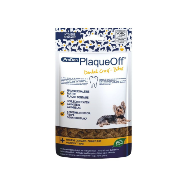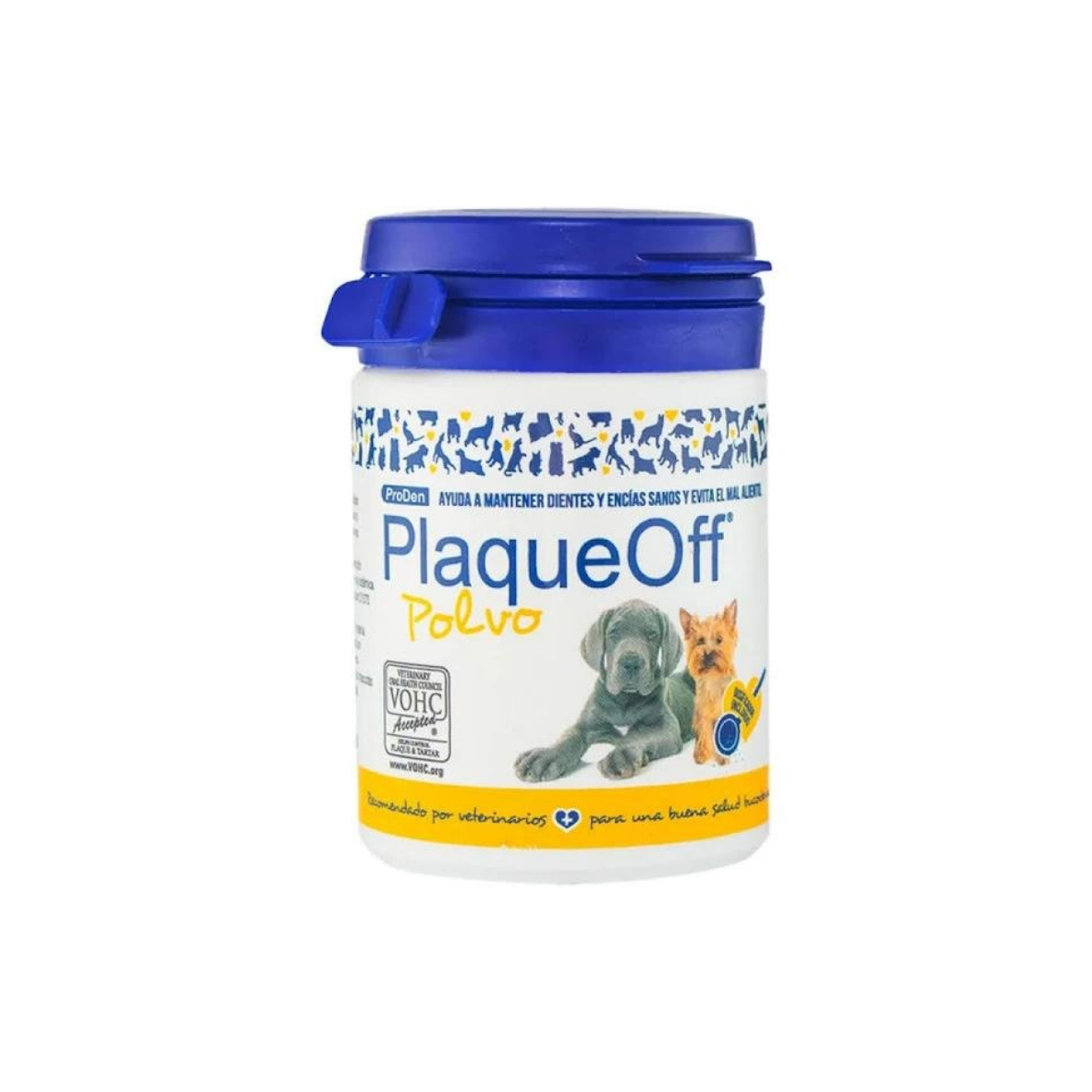 ProDen PlaqueOff es un complemento en la higiene dental de perros que ayuda a eliminar el sarro y mejorar el aliento de una manera 100% natural, aprobado por VOHC (Veterinary Oral Health Council) y su efectividad se ha comprobado clínicamente. Viene en un práctico polvo que puedes agregar a su alimento diariamente y podrás observar mejoría a partir de 3 a 5 semanas de uso.