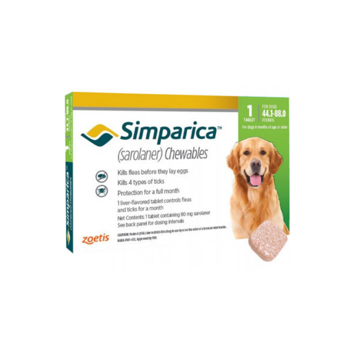 SIMPARICA® 80 mg de ZOETIS® es un comprimido masticable indicado para el tratamiento de infestaciones por pulgas, garrapatas y tratamiento de la sarna sarcóptica (Sarcoptes Scabiei), Sarna demodécica (Demodex Canis) y sarna Otodéctoca (Otidectes Cynotis) en perros en perros de >20 a 40 Kg de peso. Este medicamento tiene un color marrón jaspeado con bordes redondeados y un buen sabor, para evitar el rechazo por parte de la mascota.